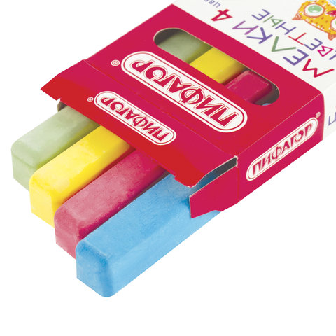 Цветной мел ПИФАГОР предназначен для письма и рисования на классных и аудиторных досках, а так же на любых шероховатых поверхностях.<br><br>Изготовлен из высококачественного природного сырья без химических добавок. Не содержит твердых включений и не портит поверхность досок. Благодаря квадратной форме легко ложится в руку. Мел средней твердости. Не оставляет царапин. Легко смывается водой. Длина - 76 мм, диаметр - 13 мм. В наборе 4 цветных мелка (красный, желтый, зеленый, голубой).<br><br>Цвет: ассорти<br>Назначение: для досок<br>Количество в упаковке: 4 шт.<br>Количество цветов: 4<br>Форма корпуса: квадратная<br>Серия: Мультики<br>Длина: 76 мм<br>Диаметр: 13 мм<br>Твердость: средней твердости<br>Упаковка: картонная коробка