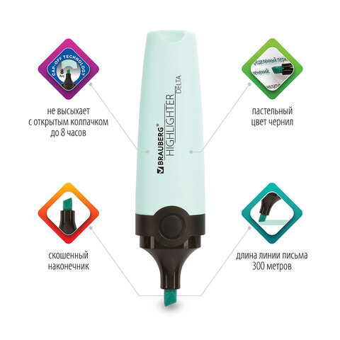 Текстовыделитель BRAUBERG "DELTA PASTEL" предназначен для выделения текста на бумаге любого типа, включая факс-бумагу.<br><br>Текстовыделитель бирюзового цвета имеет овальную форму корпуса, диаметр которого 25 мм. Особый пастельный оттенок создает мягкие переходы и позволяет равномерно выделить текст. Скошенный наконечник имеет толщину линии письма от 1 до 5 мм, что обеспечивает удобство при работе с текстом, напечатанным мелким шрифтом, или таблицами. Благодаря особой водной основе чернил текстовыделитель не высыхает без колпачка в течение 8 часов. Текстовыделитель обладает экономным расходом чернил, при этом длина линии письма достигает 300 метров. Чернила быстро впитываются и тем самым предотвращают размазывание в процессе использования. Цвет колпачка и корпуса тексстовыделителя соответствует цвету чернил.<br><br>Цвет чернил: бирюзовый<br>Количество в комплекте: 1 шт.<br>Форма наконечника: скошенный<br>Спецэффект цвета чернил : пастельный<br>Основа чернил: водная<br>Серия: Delta<br>Мин. толщина линии письма: 1 мм<br>Макс. толщина линии письма: 5 мм<br>Форма корпуса: овальная<br>Диаметр корпуса: 25 мм<br>Упаковка: картонный дисплей