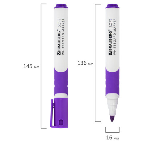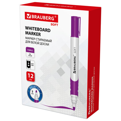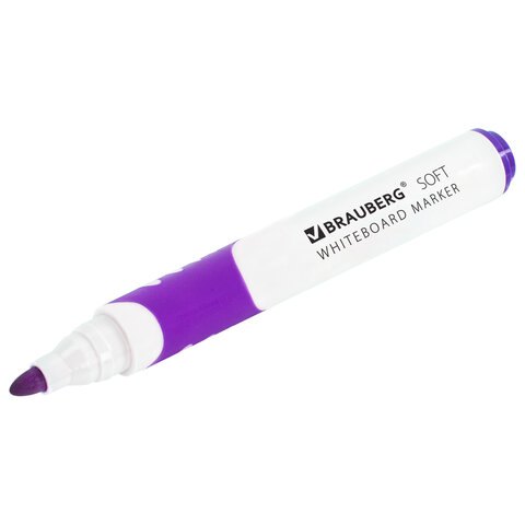Высококачественный маркер BRAUBERG "SOFT" для белой доски. Предназначен для письма на досках с магнитно-маркерной поверхностью.<br><br>Маркер для доски фиолетового цвета обладает круглым пластиковым корпусом диаметром 17 мм. Корпус оснащен удобной прорезиненной зоной захвата для более удобного использования. Наконечник круглой формы обеспечивает толщину линии письма 5 мм, что позволяет писать крупным шрифтом, который будет хорошо виден. Основа чернил - спиртовая. Чернила быстро высыхают и не оставляют разводов, легко стираются сухой губкой. Изделие не перезаправляется. Цвет колпачка и прорезиненной вставки соответствует цвету чернил.<br><br>Цвет: фиолетовый<br>Серия: Soft<br>Толщина линии письма: 3, 3,5, 4, 5<br>Наконечник: круглый<br>Количество в комплекте: 1 шт.<br>Основа чернил: спиртовая<br>Чернила стираются сухой губкой: да<br>Не протекает при перепаде давления: да<br>Наличие клипа на колпачке: да<br>Материал корпуса: пластик
