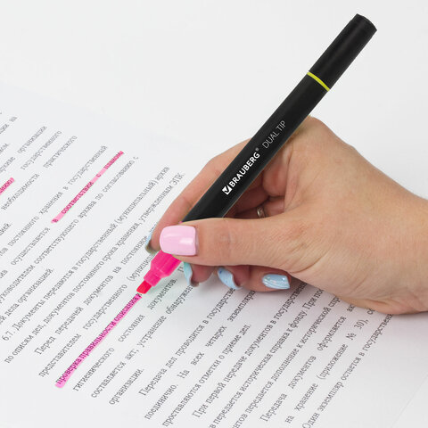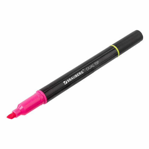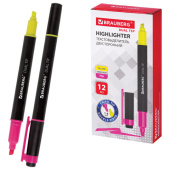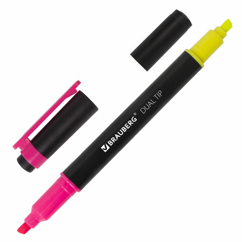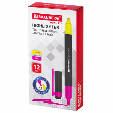 Текстовыделитель BRAUBERG предназначен для выделения текста на бумаге любого типа, включая факс-бумагу.<br><br>Двусторонний текстовыделитель неоновых цветов - желтый/розовый - обладает круглой формой корпуса диаметром 11 мм. Корпус тектовыделителя оснащен удобной зоной захвата. Скошенный наконечник имеет толщину линии письма от 1 до 4 мм, что обеспечивает удобство при работе с текстом, напечатанным мелким шрифтом, или таблицами. Текстовыделитель обладает экономным расходом чернил. Светоустойчивые чернила на водной основе не выцветают даже на открытом солнце и не размазываются в процессе использования. Изделие не перезаправляется. Цвет клипа соответствует цвету чернил.<br><br>Цвет чернил: желтый/розовый<br>Количество в комплекте: 1 шт.<br>Форма наконечника: скошенный<br>Спецэффект цвета чернил : неоновый<br>Основа чернил: водная<br>Двусторонний: да<br>Серия: DOUBLE<br>Мин. толщина линии письма: 1 мм<br>Макс. толщина линии письма: 4 мм<br>Повышенная светостойкость: да<br>Форма корпуса: круглая<br>Диаметр корпуса: 11 мм<br>Эргономичная зона захвата: да<br>Наличие клипа: да<br>Упаковка: картонная коробка