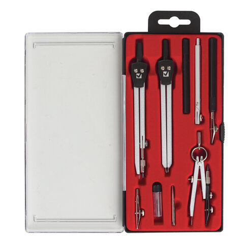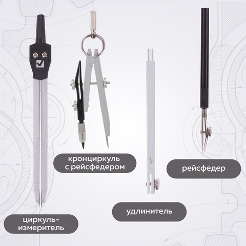 ----Готовальня BRAUBERG "Architect", 9 предметов: циркуль + измер + кронциркуль, рейсфедер + держатель, 2 вставки, удлинитель, грифель, 210353