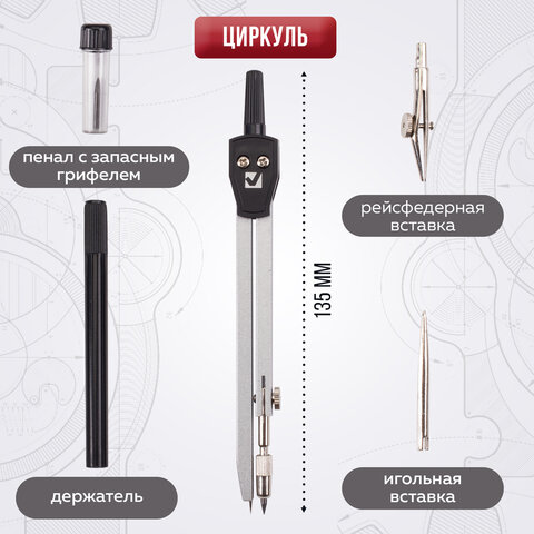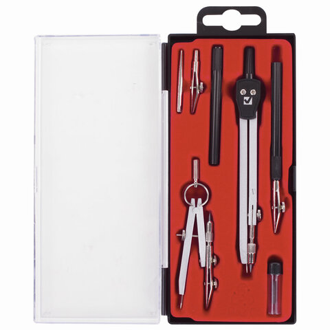 Поставляется в пластиковом пенале с прозрачной крышкой и с европодвесом.<br><br>Тип товара: готовальня<br>Серия: Architect<br>Количество предметов: 7 шт.<br>Длина циркуля: 135 мм<br>Тип штанги: одна сгибаемая<br>Комплектация: игольная вставка, кронциркуль, пенал с запасным грифелем, рейсфедер, рейсфедерная вставка и держатель, циркуль<br>Цвет корпуса: черный/серебристый<br>Материал: металл<br>Упаковка: пластиковый пенал с европодвесом -
