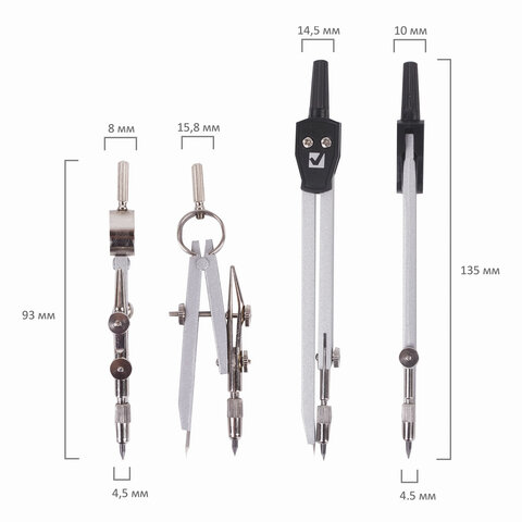 Циркуль длиной 135 мм имеет одну сгибаемую штангу. Изготовлен из металла, дополнительный цвет элементов - черный.