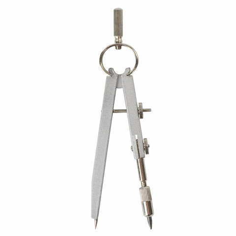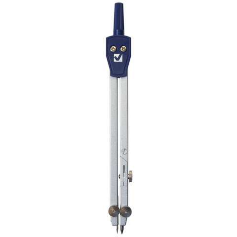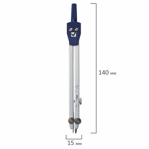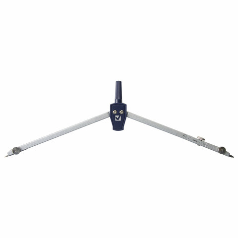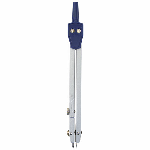 Циркуль длиной 140 мм имеет одну сгибаемую штангу и подстраиваемую иглу. Изготовлен из металла, дополнительный цвет элементов – синий.