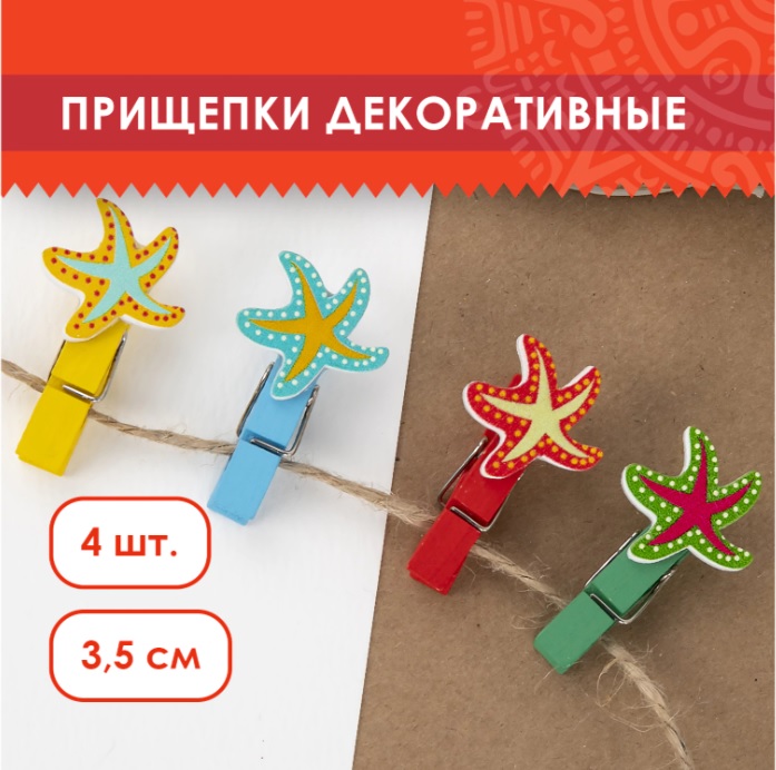 ----Прищепки декоративные МОРСКИЕ ЗВЕЗДЫ, 4 штуки, 3,5 см, ассорти, ОСТРОВ СОКРОВИЩ, 661293