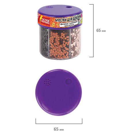 Индивидуальный стикер со штрих-кодом на каждом диспенсере с дозатором. В каждой секции дозатора по 9 грамм блесток.<br><br>Количество цветов в наборе: 6 шт. <br>Особенности: фигурные, цвет металлик<br>Цвет: бронза, золото, медь, платина, серебро, стальной<br>Материал: полиэтилен<br>Вес цвета: 9 г<br>Возрастная группа: от 6 лет лет<br>Тип товара: блестки для декора в диспенсере<br>Серия: Металлик<br>Упаковка: диспенсер с дозатором -