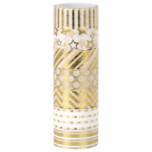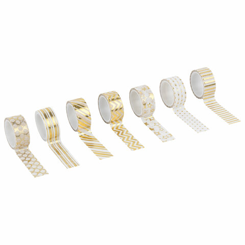 Товар относится к среднему ценовому сегменту.<br><br>Ширина ленты: 15 мм<br>Длина намотки: 3 м<br>Количество в упаковке: 7 шт.<br>Количество дизайнов в упаковке: 7 шт.<br>Тон: Золотистый<br>Тип клейкой ленты: декоративная<br>Серия: Фольгированные<br>Цвет: белый, золотистый<br>Основа: бумага<br>Упаковка: термоусадочная пленка -