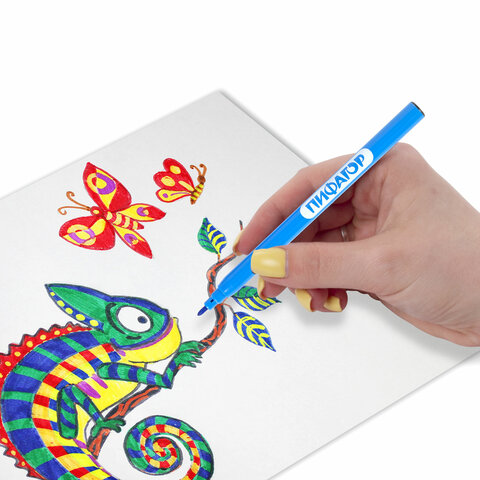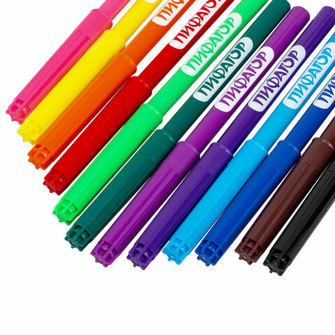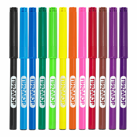 Фломастеры ПИФАГОР "Веселая такса" подарят отличные впечатления в процессе раскрашивания каждому ребенку. Рисование способствует развитию мелкой моторики рук у детей, координации движений кистей и пальцев, что благоприятно влияет на творческое мышление.<br><br>Обладают яркими цветами в количестве 12 штук. Имеют удобную круглую форму корпуса, длина которого 145 мм, а диаметр - 8 мм. Благодаря толщине линии письма 1 мм и диаметру пишущего узла 1,8 мм процесс раскрашивания становится легким. Длина письма составляет 600 м: такого расхода хватит надолго. Фломастеры легко смываются с большинства материалов и кожи. Корпус изготовлен из качественного полипропилена, который значительно продлевает срок службы фломастеров. Колпачок оснащен специальными прорезями для вентиляции, которые делают использование фломастеров более безопасным. Рекомендованы для детей от 3-х лет.<br><br>Количество цветов: 12<br>Форма корпуса: круглая<br>Эффект чернил: без эффекта<br>Тип чернил: смываемые<br>Серия: Веселая такса<br>Ширина линии письма: 1 мм<br>Пишущий узел: 1.8 мм<br>Длина письма: 600 м<br>Длина корпуса: 145 мм<br>Диаметр корпуса: 8 мм<br>Вентилируемый колпачок: да<br>Упаковка: ПВХ-конверт с европодвесом