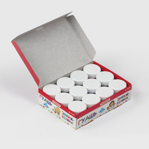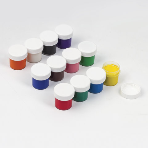 В наборе 12 ярких цветов: белый, черный, красный, желтый, синий, зеленый, оранжевый, фиолетовый, светло-зеленый, голубой, розовый, коричневый. Краски полностью безопасны в использовании, не токсичны и не имеют резкого запаха. Гуашь обладает высокой светостойкостью и укрывистостью, легко размывается водой, хорошо наносится, без труда удаляется с рук и одежды. Краска находится в пластмассовой герметичной баночке, объем которой равен 10 мл. Общий объем – 120 мл. Ребенок сможет легко открыть баночки с винтовыми крышками без помощи взрослых.