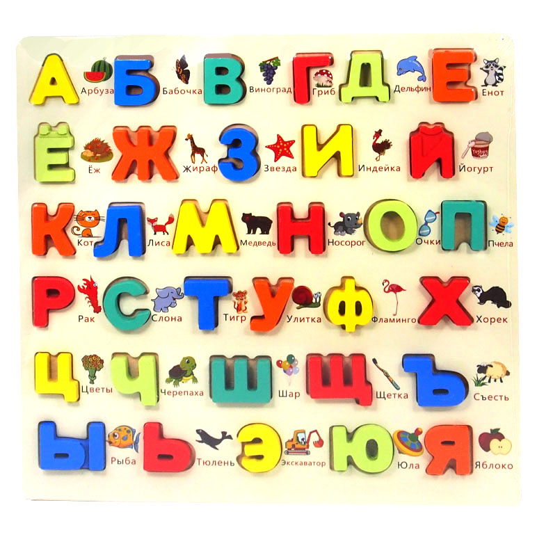 Деревянный алфавит «Изучаем буквы» поможет дошколятам познакомиться с буквами! Набор состоит из доски-основания с углублениями и 33-х букв. Рядом с каждым углублением для буквы имеется изображение-подсказка, название которого начинается на эту букву.