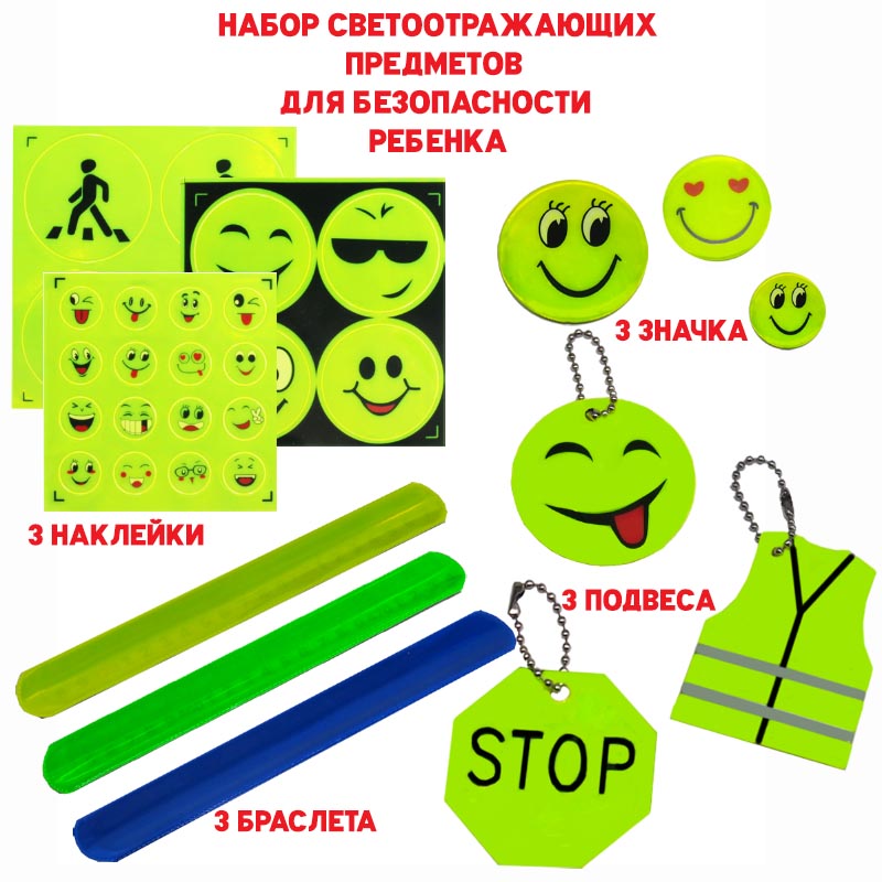 ----Набор №1 светоотражающий для безопасности детей и взрослых 12 шт. наклейки, браслеты, брелок, значки