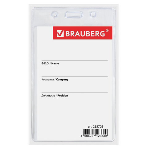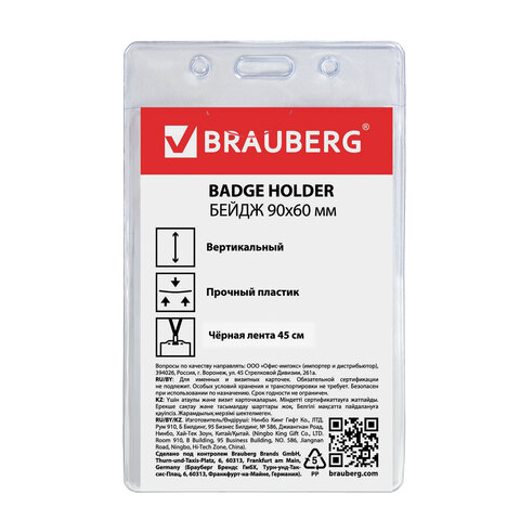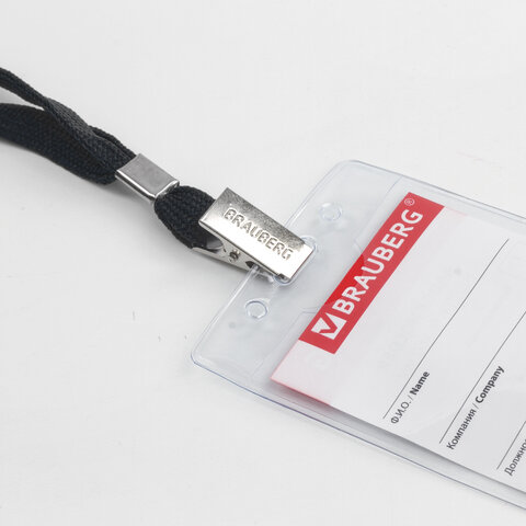 Вертикальный бейдж BRAUBERG для именной карточки предназначен для идентификации сотрудников в компаниях, а также на семинарах, тренингах, презентациях и других мероприятиях.<br><br>Бейдж на текстильной черной ленте используется для размещения именных карточек, пропусков, пластиковых карт. Карман из мягкого прочного пластика гарантирует долгий срок службы. Закрепляется лентой 45 см. Размер вкладыша 90х60 мм.<br><br>Тип бейджа: классический<br>Тип крепления: лента<br>Положение: вертикальное<br>Количество в комплекте: 1 шт.<br>Размер вкладыша (ДхШ): 90х60 мм<br>Размер бейджа (ДхШ): 107х65 мм<br>Серия: Vertical<br>Цвет крепления: черный<br>Материал корпуса: мягкий пластик<br>Цвет корпуса: прозрачный<br>Длина ленты/шнурка: 45 см