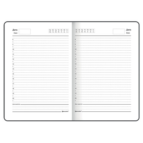 Недатированный ежедневник BRAUBERG предназначен для ведения записей. Отсутствие дат делает его уникальным товаром, которым можно начать пользоваться в любое время года. Надежен и практичен в применении.<br><br>Внутренний блок содержит 128 листов офсетной бумаги плотностью 65 г/м2. Обложка 7БЦ (твердый переплет с матовой пленкой) обеспечивает долгий срок службы. Снабжен резинкой-фиксатором, благодаря чему ежедневник не откроется в сумке или портфеле.
