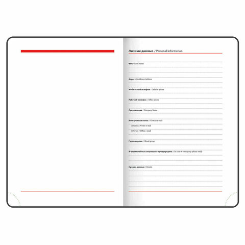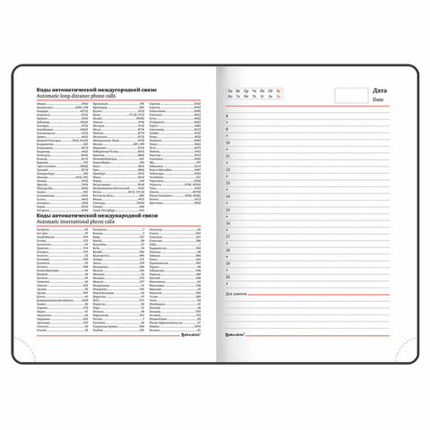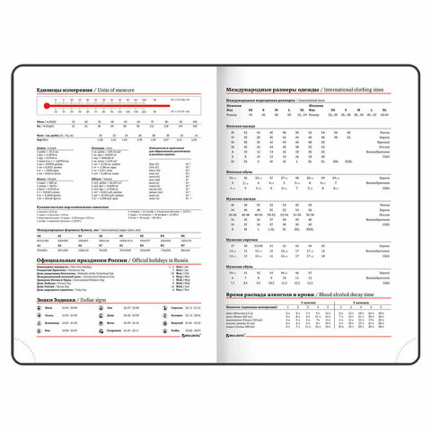 Срез ежедневника прокрашен, что придает ему особый шарм. Дополнением является закладка-ляссе, с помощью которой можно быстро открыть ежедневник на нужной странице. Помимо прочего ежедневник снабжен справочным материалом. В конце ежедневника есть 3 страницы для записей и заметок.