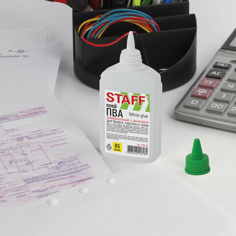 Клей ПВА STAFF применяется для склеивания бумаги, картона, фотографий, дерева.<br><br>Имеет объем 85 мл. Флакон оснащен пластиковым дозатором, который позволяет равномерно и точно наносить клей на поверхность. Нетоксичен, морозоустойчивый. Быстрое склеивание достигается за счет нанесения тонкого слоя клея. Экономичное расходование. Съемный колпачок предохраняет клей от засыхания. Необходимо взболтать перед применением.<br><br>Вес: 85 г<br>Количество в комплекте: 1 шт.<br>Назначение: бумага, картон, текстиль, фотографии<br>Серия: Everyday<br>Вид аппликатора: дозатор<br>Морозоустойчивый: да