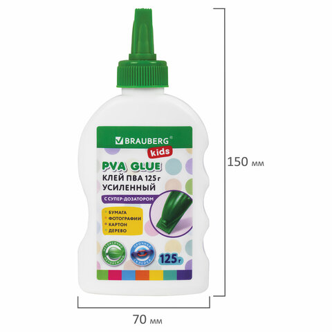 Клей ПВА BRAUBERG KIDS предназначен для склеивания изделий из бумаги, картона, дерева, фотографий.<br><br>Увеличенный объем – 125 мл.