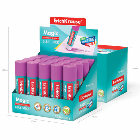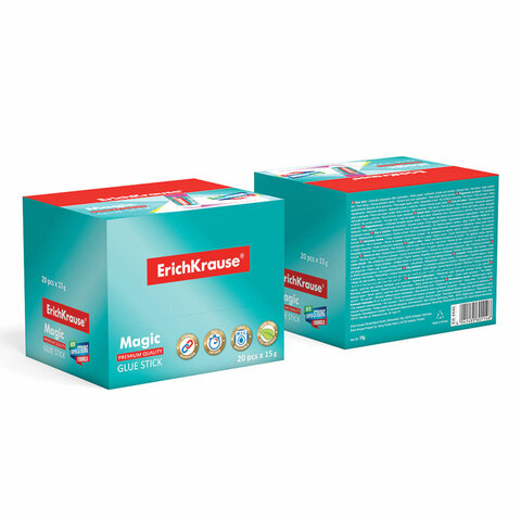 Клей-карандаш ERICH KRAUSE с клеящим полимерным компонентом подкрашен пигментом, который обесцвечивается при контакте с воздухом. Слой клея на бумаге хорошо виден, что помогает наносить клей предельно точно и аккуратно.<br><br><br><br>Вес: 15 г<br>Количество в комплекте: 20 шт.<br>Основа клея: PVP<br>Цветовой пигмент: да<br>Назначение: бумага, картон, текстиль<br>Серия: Magic<br>Дизайн: Классический<br>Форма корпуса: круглая<br>Срок годности: 24 мес.