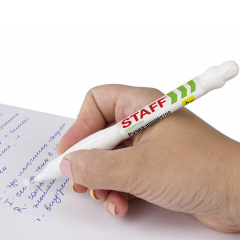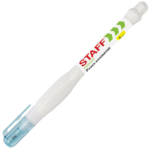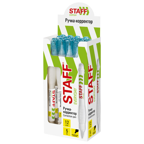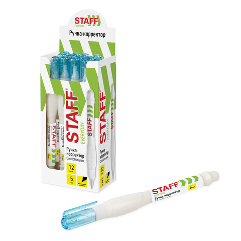 Компактная ручка-корректор STAFF предназначена для исправлений текста на любых типах бумаги.<br><br>Быстросохнущий корректор мини-формата (объем 5 мл) на спиртовой основе легко помещается в пенал или карман. Круглый удобный корпус. Морозоустойчивый. Надежный металлический наконечник. Клапанный механизм ручки предотвращает самопроизвольное вытекание: подача жидкости осуществляется с помощью нажатия на наконечник. На корпус ручки не следует оказывать повышенное физическое давление, за исключением случаев, когда ручкой давно не пользовались. Перед началом использования ОБЯЗАТЕЛЬНО встряхните ручку.<br><br>Тип товара: ручка-корректор<br>Объем: 5 мл<br>Количество в комплекте: 1 шт.<br>Подача корректуры: металлический наконечник<br>Морозоустойчивый: да<br>Быстросохнущий состав: да<br>Экономный расход жидкости: да<br>Серия: Everyday<br>Основа: спиртовая<br>Упаковка: картонная коробка