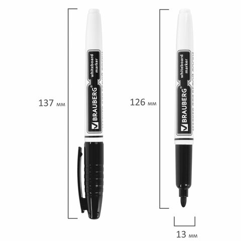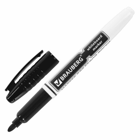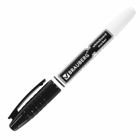 Высококачественный маркер BRAUBERG для белой доски. Предназначен для письма на досках с магнитно-маркерной поверхностью.<br><br>Маркер для доски черного цвета обладает круглым пластиковым корпусом диаметром 12 мм. Наконечник круглой формы обеспечивает толщину линии письма 4 мм, что позволяет писать крупным шрифтом, который будет хорошо виден. Благодаря спиртовой основе чернила быстро высыхают и не оставляют разводов, легко стираются сухой губкой. Изделие не перезаправляется. Цвет колпачка соответствует цвету чернил.<br><br>Цвет: черный<br>Серия: WBM<br>Толщина линии письма: 4<br>Наконечник: круглый<br>Количество в комплекте: 1 шт.<br>Основа чернил: спиртовая<br>Чернила стираются сухой губкой: да<br>Наличие клипа на колпачке: да<br>Материал корпуса: пластик