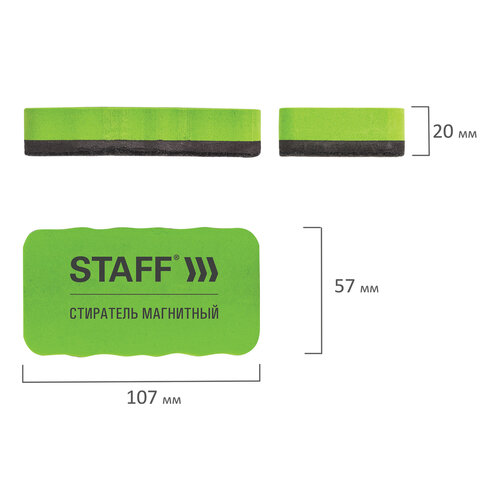 Стиратель магнитный STAFF предназначен для стирания надписей, сделанных маркером с белых досок, сухим способом.<br><br>Встроенный магнит позволяет расположить стиратель в любом месте рабочей поверхности доски. Стиратель имеет эргономичную форму размером 107х57 мм. Стирающий слой выполнен из фетра. Поставляется в упаковке с европодвесом.