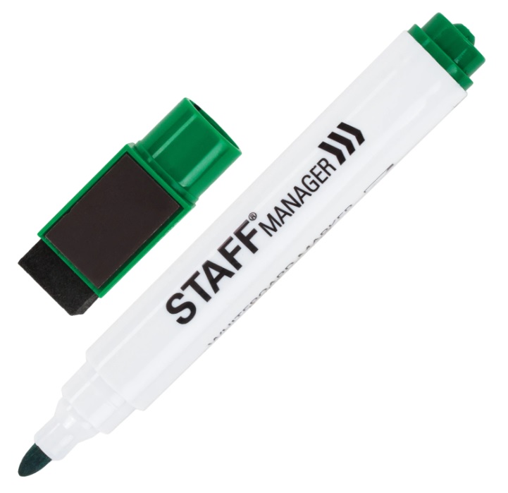 Маркер стираемый для белой доски на магните со стирателе, ЗЕЛЕНЫЙ, STAFF Manager WBM-002, 3мм,152005