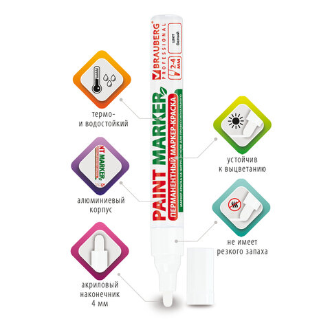 Маркер-краска лаковый BRAUBERG предназначен для маркировки различных материалов в промышленных условиях: бетона, дерева, стекла, металла, резины, пластика. Также подходит для творчества и декорирования.<br><br>СПОСОБ ПРИМЕНЕНИЯ: