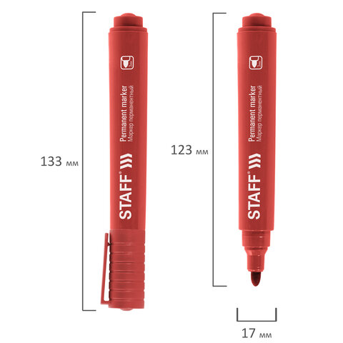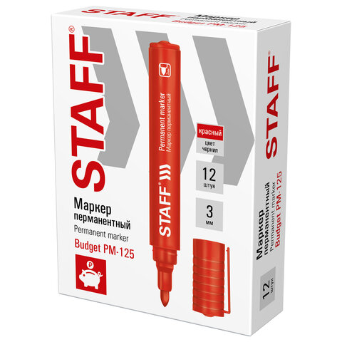Перманентный маркер STAFF "Basic Budget PM-125" отлично подходит для повседневного использования. Предназначен для письма на любой поверхности: бумага, полиэтилен, дерево, стекло, металл, натуральная кожа, ткань, камень, плитка.<br><br>Маркер перманентный красного цвета обладает круглым корпусом, диаметр которого 17 мм и длина 133 мм. Толщина линии письма - 3 мм. Особая нестираемая основа перманентного маркера обеспечивает такие качества, как стойкость к воздействию воды, низких и высоких температур. Благодаря спиртовой основе чернила быстро сохнут и не размазываются. Износостойкий наконечник устойчив к повреждениям и обеспечивает экономный расход чернил. Изделие не перезаправляется. Плотный колпачок с клипом предотвращает высыхание наконечника и чернил. Цвет корпуса и колпачка соответствует цвету чернил.