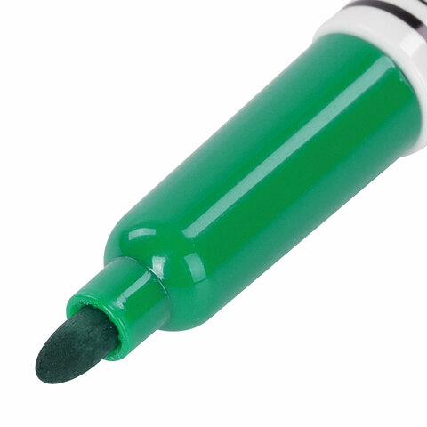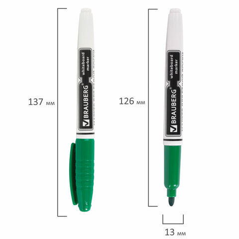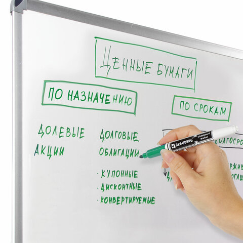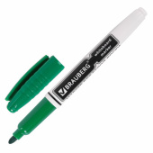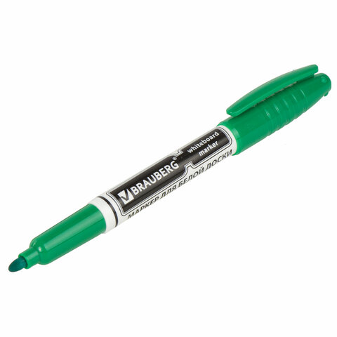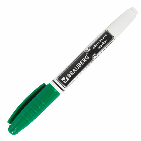 Высококачественный маркер BRAUBERG для белой доски. Предназначен для письма на досках с магнитно-маркерной поверхностью.<br><br>Маркер для доски зеленого цвета обладает круглым пластиковым корпусом диаметром 12 мм. Наконечник круглой формы обеспечивает толщину линии письма 4 мм, что позволяет писать крупным шрифтом, который будет хорошо виден. Благодаря спиртовой основе чернила быстро высыхают и не оставляют разводов, легко стираются сухой губкой. Изделие не перезаправляется. Цвет колпачка соответствует цвету чернил.<br><br>Цвет: зеленый<br>Серия: WBM<br>Толщина линии письма: 4<br>Наконечник: круглый<br>Количество в комплекте: 1 шт.<br>Основа чернил: спиртовая<br>Чернила стираются сухой губкой: да<br>Наличие клипа на колпачке: да<br>Материал корпуса: пластик