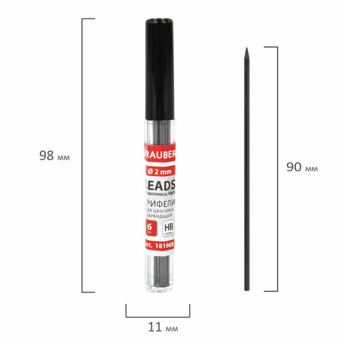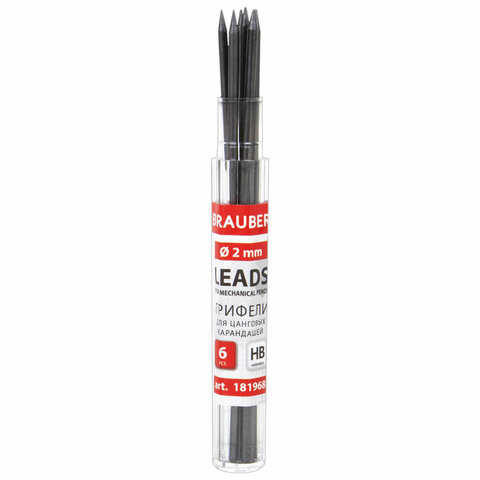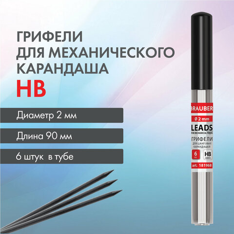 ----Грифели для цангового карандаша 2 мм, HB, КОМПЛЕКТ 6 шт., в тубе, BRAUBERG, 181968