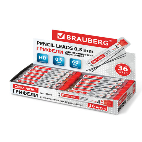 ----Грифели запасные 0,5 мм, HB, BRAUBERG, КОМПЛЕКТ 12 шт., "Hi-Polymer", 180445