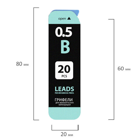 Грифели имеют твердость В. Длина изделия – 60 мм, а диаметр – 0,5 мм. Цвет – серый. Комплект – 20 шт. Товар поставляется в диспенсере, имеется индивидуальная упаковка – пластиковая туба.
