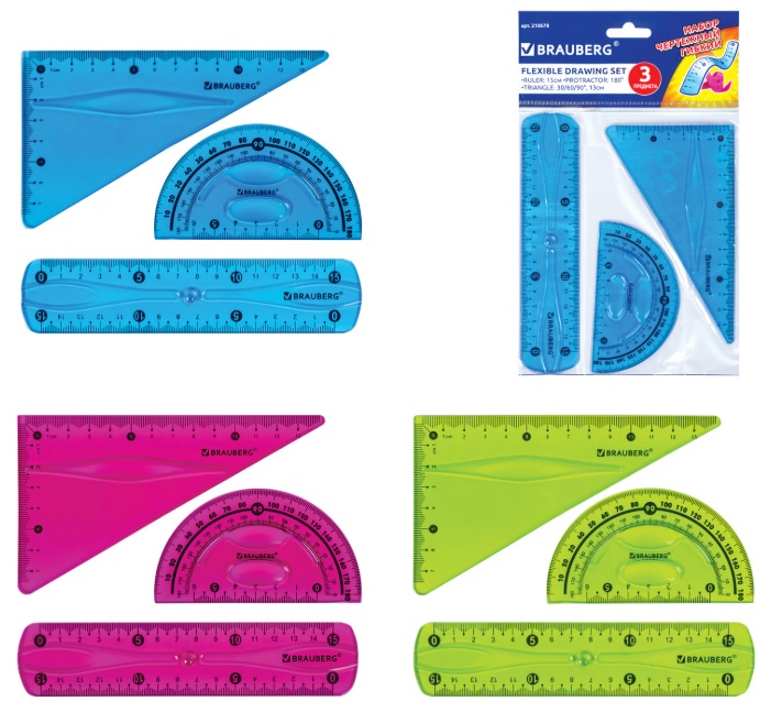 ----Набор чертежный малый гибкий BRAUBERG "FLEX" (линейка 15см, угольник, транспортир), ассорти, 210678