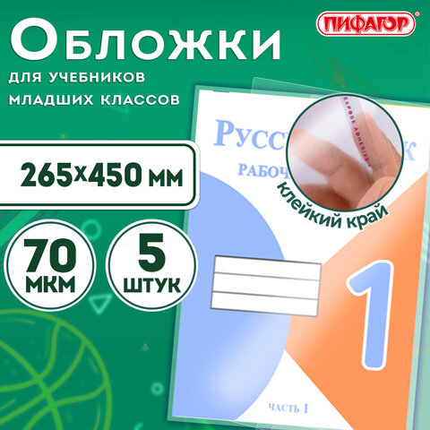 Обложки ПП для учебников мл. классов, КОМПЛЕКТ 5 шт, КЛЕЙКИЙ КРАЙ, 70мкм, 265х450мм, ПИФАГОР, 227415