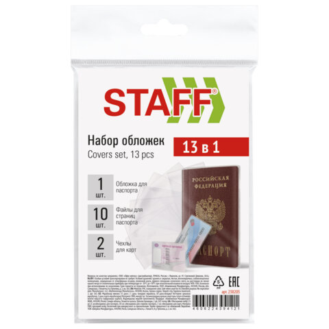----Обложка для паспорта НАБОР 13 шт. (паспорт - 1 шт., страницы паспорта - 10 шт., карты - 2 шт.), ПВХ, STAFF, 238205