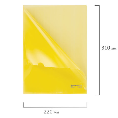 Папка-уголок BRAUBERG предназначена для хранения и транспортировки документов и является незаменимым атрибутом для студента, школьника или офисного работника.<br><br>Папка формата А4 выполнена из высококачественного полипропилена плотностью 150 мкм. Она предотвращает смятие, загрязнение или намокание бумаг. Прозрачный материал позволяет определить содержимое, не открывая папку. Специальная выемка для перелистывания листов облегчает работу с документами. Данная папка заметно выделяется среди других благодаря яркому желтому цвету.<br><br>Вид папки: прозрачная<br>Толщина пластика: 150 мкм<br>Формат: А4<br>Количество отделений: 1<br>Количество в комплекте: 1 шт.<br>Серия: Strong<br>Особенности: вырез для извлечения бумаг<br>Цвет: желтый<br>Высота: 310 мм<br>Ширина: 220 мм