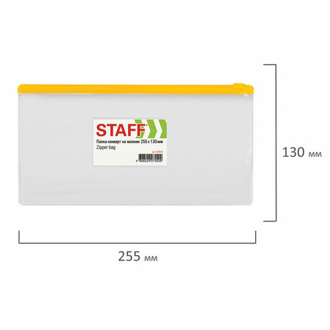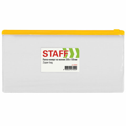 Папка-конверт на молнии STAFF идеально подойдет для хранения и транспортировки важных документов.<br><br>Изготовлена из прочного прозрачного пластика толщиной 0,12 мм с гладкой фактурой. Размер - 255х130 мм. Герметичная застежка-зиплок защищает документы от механических повреждений, а также пыли и влаги. Имеется карман для визитки. Цвет молнии - ассорти (поставляется без возможности выбора).<br><br>Формат: 255x130 мм<br>Серия: Zipper<br>Фактура: гладь<br>Количество отделений: 1 шт.<br>Карман для визитки: да<br>Застежка: зиплок<br>Цвет: прозрачный<br>Цвет молнии: ассорти<br>Высота: 130 мм<br>Ширина: 255 мм<br>Толщина пластика: 120 мкм<br>Материал: ПВХ