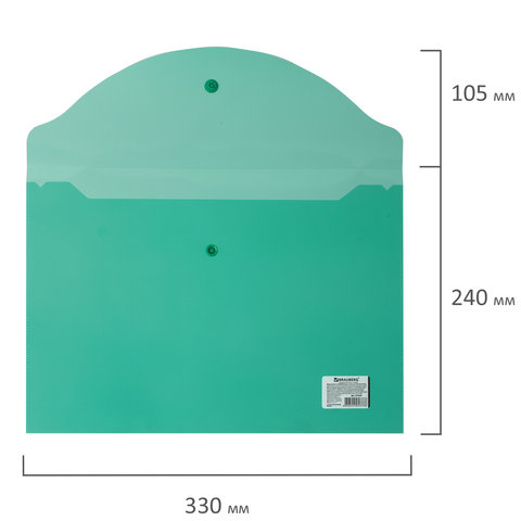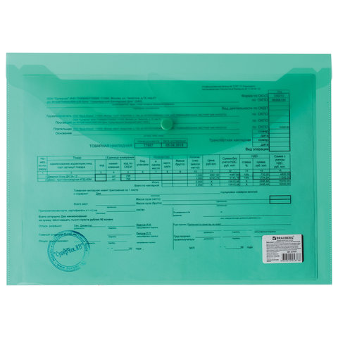 Папка с кнопкой BRAUBERG - универсальная модель для хранения, транспортировки и защиты документов и мелких предметов от негативных внешних факторов. Станет незаменимым помощником для школьников, студентов, офисных работников и творческих людей.<br><br>Папка-конверт с гладкой фактурой формата А4 изготовлена из плотного прозрачного пластика зеленого цвета толщиной 150 мкм. Закрывается на защелку-кнопку, что делает удобным частое использование и обеспечивает быстрый доступ к ее содержимому. Папка способна вместить до 100 листов стандартной плотности.<br><br>Формат: А4<br>Ориентация: горизонтальная<br>Вмещает до: 100 листов<br>Фактура: гладкая<br>Тип пластика: прозрачный<br>Серия: Standard<br>Дизайн: зеленый<br>Количество в комплекте: 1 шт.<br>Толщина пластика: 150 мкм<br>Тип замка: кнопка<br>Цвет: зеленый<br>Высота: 240 мм<br>Ширина: 330 мм<br>Глубина: 3 мм<br>Материал: полипропилен