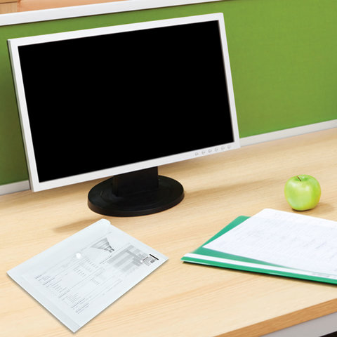 Папка-конверт с гладкой фактурой формата А4 изготовлена из плотного прозрачного пластика толщиной 150 мкм. Закрывается на защелку-кнопку, что делает удобным частое использование и обеспечивает быстрый доступ к ее содержимому. Папка способна вместить до 100 листов стандартной плотности.