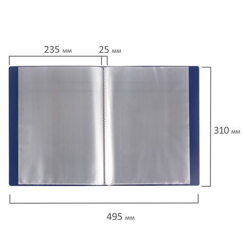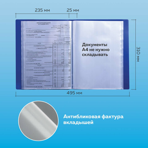 Папка BRAUBERG "Стандарт" солидного синего цвета отлично подходит для хранения документов, составления каталогов, меню и т.п.<br><br>На корешке имеется карман для маркировки содержимого. Папка изготовлена из качественного пластика толщиной 0,7 мм с антибликовой фактурой, а ширина корешка составляет 25 мм. Содержит 40 вкладышей, позволяющих хранить документы формата А4 и обеспечивающих их надежную защиту от попадания влаги, пыли и прочих повреждений. Поставляется в индивидуальной упаковке.<br><br>Количество карманов: 40 шт.<br>Формат: А4<br>Ширина корешка: 25 мм<br>Антибликовая фактура: да<br>Цвет: синий<br>На корешке папки: карман<br>Серия: Стандарт<br>Фактура: песок<br>Толщина пластика: 0.7 мм<br>Материал: пластик<br>Индивидуальная упаковка: да