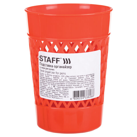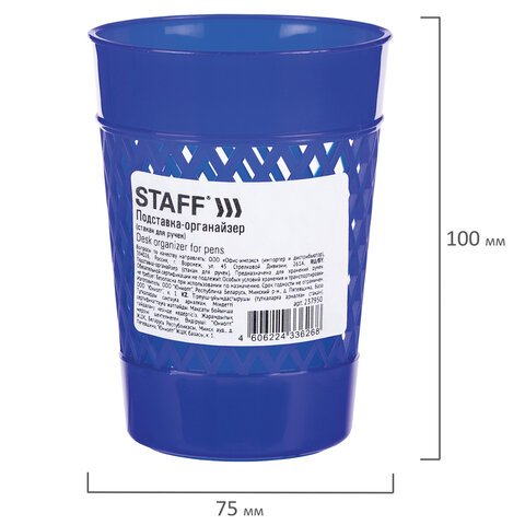 Практичная и долговечная пластиковая подставка-органайзер STAFF предназначена для хранения различных канцелярских принадлежностей.<br><br>Изготовлена из пластика. Состоит из одного отделения. Поставляется без канцелярского наполнения.<br><br>Тип товара: стакан для ручек<br>Цвет: ассорти<br>Материал: полипропилен<br>Количество в комплекте: 1 шт.<br>Количество отделений: 1<br>Серия: нет<br>Поставляется без наполнения: да<br>Высота: 75 мм<br>Длина: 75 мм<br>Ширина: 100 мм