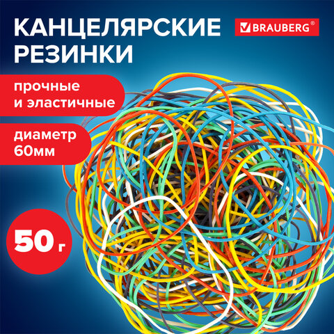 Банковские резинки BRAUBERG незаменимы во многих сферах жизни – они активно используются в банковском деле, бухгалтерии, офисах, рукоделии и быту. предназначены для фасовки и упаковки денежных купюр.<br><br>Благодаря натуральному каучуку они могут свободно растягиваться в несколько раз и мгновенно возвращаются к своему первоначальному диаметру, равному 60 мм. Толщина в 1,5 мм гарантирует прочность изделия. Вес - 50 г, количество в упаковке - около 75 штук. Цвет - ассорти.<br><br>Диаметр: 60 мм<br>Серия: Standard <br>Толщина изделия: 1.5 мм<br>Вес: 50 г<br>Материал: натуральный каучук<br>Цвет: разноцветный