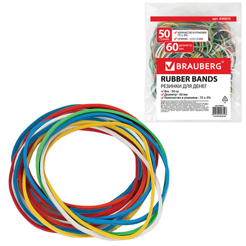 ----Резинки банковские универсальные диаметром 60 мм, BRAUBERG 50 г, цветные, натуральный каучук, 440035