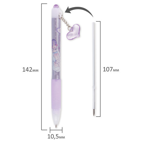 Автоматическая шариковая ручка с грипом BRAUBERG "First Love" - яркий аксессуар для ежедневного использования.<br><br>Ручка с цветной печатью на корпусе и подвеской, а тажке резиновым грипом для удобства письма, исключающим скольжение пальцев. Сменный стержень длиной 107 мм. Диаметр пишущего узла 0,5 мм создает ровную линию письма, равную 0,3 мм. Цвет чернил - синий. Необычный дизайн корпуса ручки привлекут внимание как школьников, так и взрослых.<br><br>Цвет чернил: синий<br>Толщина линии письма: 0.3 мм<br>Диаметр пишущего узла: 0.5 мм<br>Форма наконечника: игольчатый<br>Длина сменного стержня: 107 мм<br>Количество в комплекте: 1 шт.<br>Эргономичная зона захвата: резиновый держатель<br>Цвет корпуса: с дизайном<br>Серия: First Love<br>Дизайн: First love<br>Форма корпуса: круглая<br>Покрытие корпуса: без дополнительного покрытия<br>Упаковка: дисплей