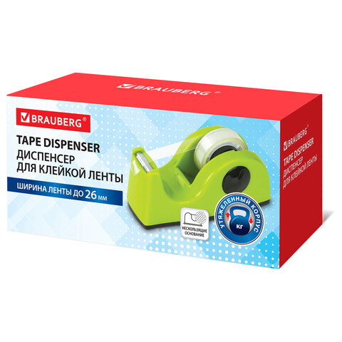 Диспенсер BRAUBERG предназначен для облегчения использования клейкой ленты. Упрощает процесс упаковки предметов, незаменим при большом объеме работ. Может применяться как для офисных, так и бытовых нужд.<br><br>Диспенсер с настольным типом размещения имеет основание с нескользящим покрытием и утяжелен песком. Изготовлен из ударопрочного пластика. Подходит для ленты шириной до 20 мм (в комплект не входит).<br><br>Тип диспенсера: настольный<br>Максимальная ширина ленты: 20 мм<br>Цвет: салатовый<br>Диаметр сердечника ленты: 25 мм<br>Особенности: основание с нескользящим покрытием<br>Материал диспенсера: пластик<br>Длина: 11.8 мм<br>Ширина: 5 мм<br>Высота: 5 мм<br>Упаковка: картонная коробка