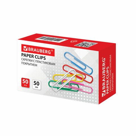 Скрепки BRAUBERG незаменимы в случаях, когда нужно соединить несколько бумаг, например, все листы договора.<br><br>Большие скрепки изготовлены из стали, имеют классическую овальную форму и цветное пластиковое покрытие. Длина скрепки составляет 50 мм. Не окисляются и не повреждают документы. 50 штук в картонной коробке.<br><br>Длина: 50 мм<br>Количество в упаковке: 50 шт.<br>Покрытие: цветное полимерное покрытие<br>Форма скрепки: овальная<br>Серия: Standard +<br>Цвет: ассорти<br>Упаковка: картонная коробка