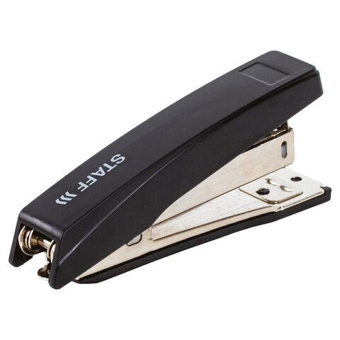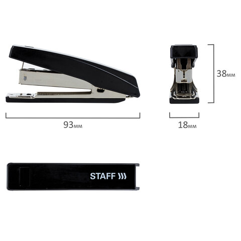 Настольный степлер STAFF № 10 обеспечит качественное скрепление документов не только в офисе, но и дома.<br><br>Настольный степлер STAFF с антистеплером в черном пластиковом корпусе с металлическим механизмом cпособен скрепить до 10 листов. Подходящий размер скоб № 10. Виды сшивания: закрытый. Глубина закладки бумаги - 50 мм. Габариты: высота - 38 мм, ширина - 18 мм, длина - 93 мм. Благодаря компактным размерам удобен в использовании и занимает мало места на рабочем столе, а классический дизайн делает степлер подходящим к любому интерьеру. Продается в картонной упаковке.