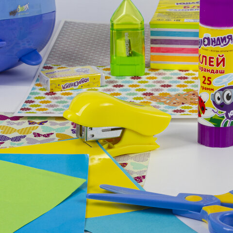 Степлер ЮНЛАНДИЯ высокого качества надолго станет незаменимым помощником при написании творческих работ.<br><br>Подходящие скобы: № 24/6, 26/6<br>Максимальное количество скрепляемых листов: 20<br>Наличие антистеплера: да<br>Вместимость скоб: 50 шт.<br>Глубина закладки бумаги: 22 мм<br>Виды сшивания степлером: закрытый, прямой<br>Наличие скоб в комплекте: да<br>Цвет корпуса: ассорти<br>Материал корпуса: пластик<br>Поставляется в нескольких вариантах цвета (без возможности выбора): да<br>Высота корпуса: 40 мм<br>Длина корпуса: 69 мм<br>Ширина корпуса: 29 мм<br>Упаковка: блистер -