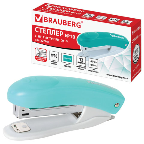 ----Степлер №10 BRAUBERG "Original", до 12 листов, с антистеплером, бирюзовый, 227765