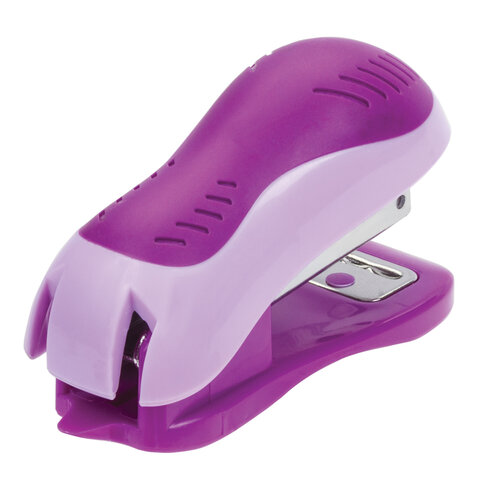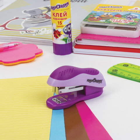 Настольный степлер ЮНЛАНДИЯ с металлическим механизмом незаменим в работе с документами. Полезный аксессуар для школы и дома.<br><br>Для скрепления до 15 листов. Размер скоб №10. Глубина закладки бумаги - 25 мм. Закрытый вид сшивания. Эргономичная форма корпуса обеспечивает продолжительное время использования без перерыва. Данная модель может выступать в качестве антистеплера, позволяющего разжать закрепленные скобы более качественно, не нанося повреждений ни материалу, ни кончикам пальцев. За счет компактных размеров не займет на парте или столе много места, а сочетание фиолетового с сиреневым цветом добавят яркости во время уроков или написания домашней работы.