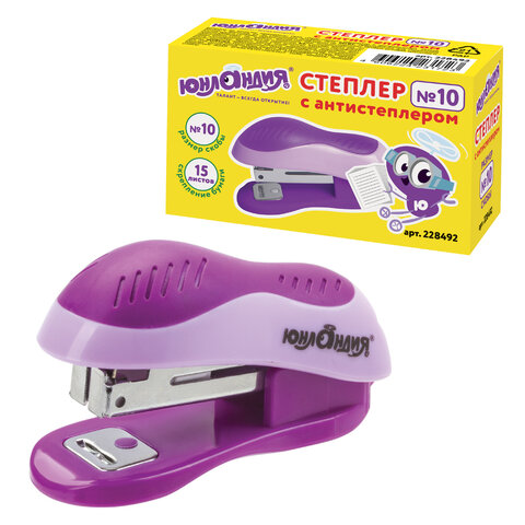 Степлер ЮНЛАНДИЯ высокого качества надолго станет незаменимым помощником при написании творческих работ.<br><br>Подходящие скобы: № 10<br>Максимальное количество скрепляемых листов: 15<br>Наличие антистеплера: да<br>Вместимость скоб: 50 шт.<br>Серия: Мини<br>Глубина закладки бумаги: 25 мм<br>Виды сшивания степлером: закрытый<br>Цвет корпуса: фиолетовый<br>Материал корпуса: пластик<br>Наличие резиновой накладки: да<br>Высота корпуса: 38 мм<br>Длина корпуса: 67 мм<br>Ширина корпуса: 25 мм<br>Упаковка: картонная коробка -